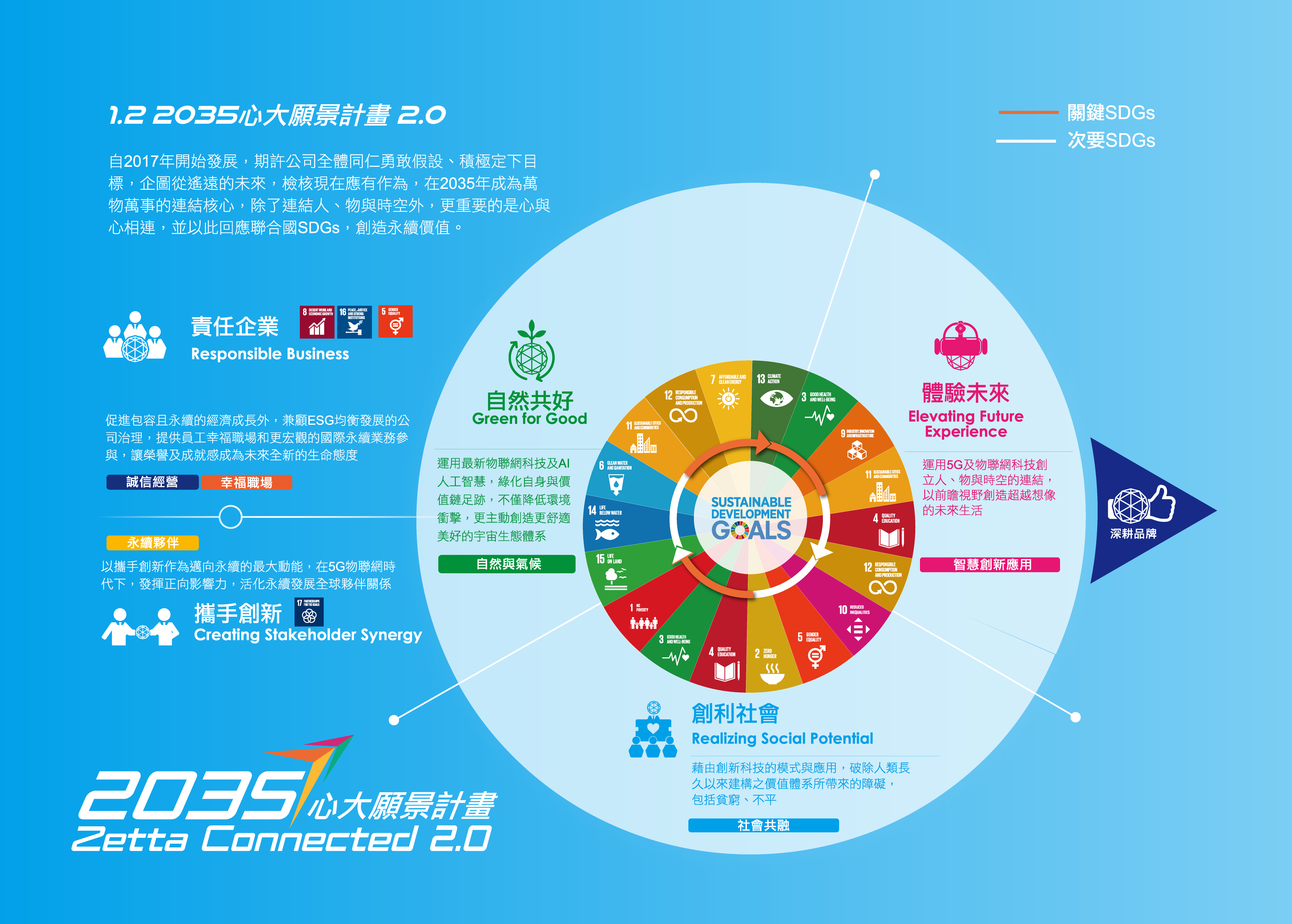 「2035心大願景計畫 2.0 (Zetta Connected 2.0) 」自2017年開始發展,期許公司全體同仁勇敢假設、積極定下目標,企圖從遙遠的未來,檢核現在應有作為,在2035年成為萬物萬事的連結核心,除了連結人、物與時空外,更重要的是心與心相連,並以此回應聯合國SDGs,創造永續價值。
