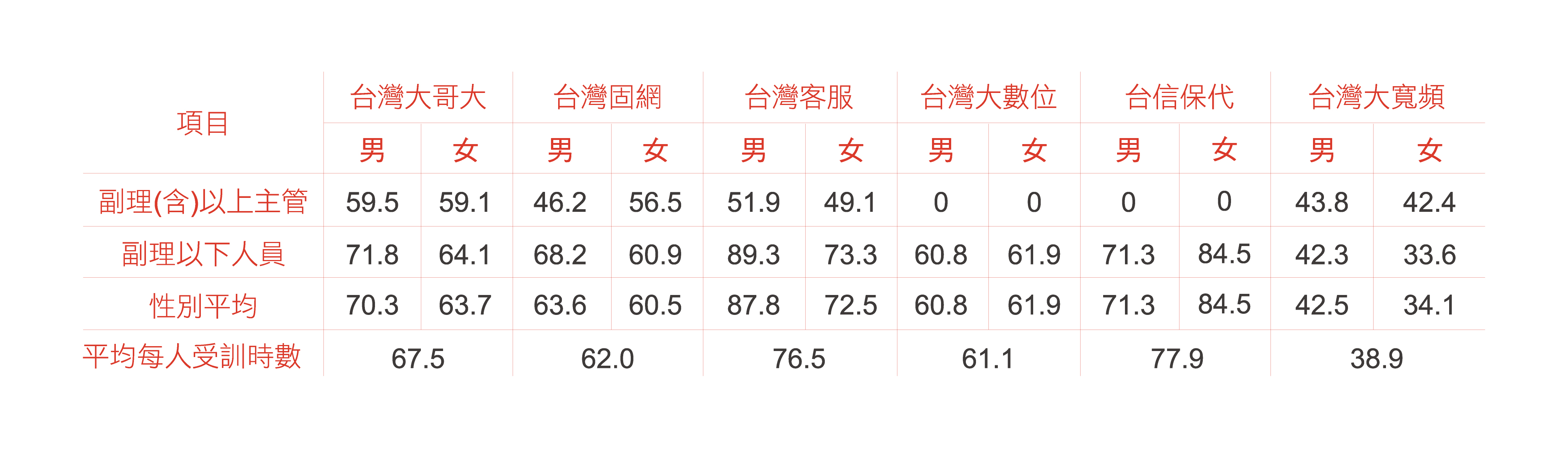 各公司2024年訓練時數統計,詳參下表,員工參與訓練課程比率為100%。