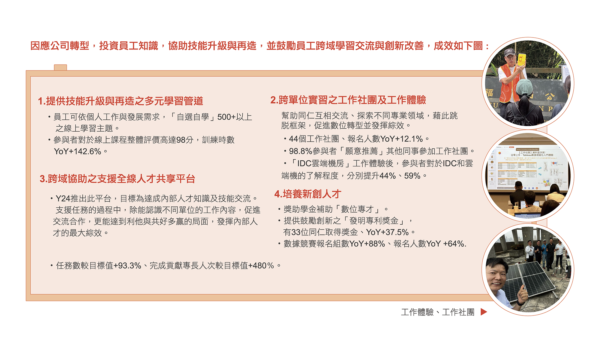 內部知識、文化的傳承交流:除鼓勵員工更邀請高階主管擔任講師,講授趨勢、市場與職場態度等重要議題,並持續安排教學觀摩、回饋來提升內講教學技巧。