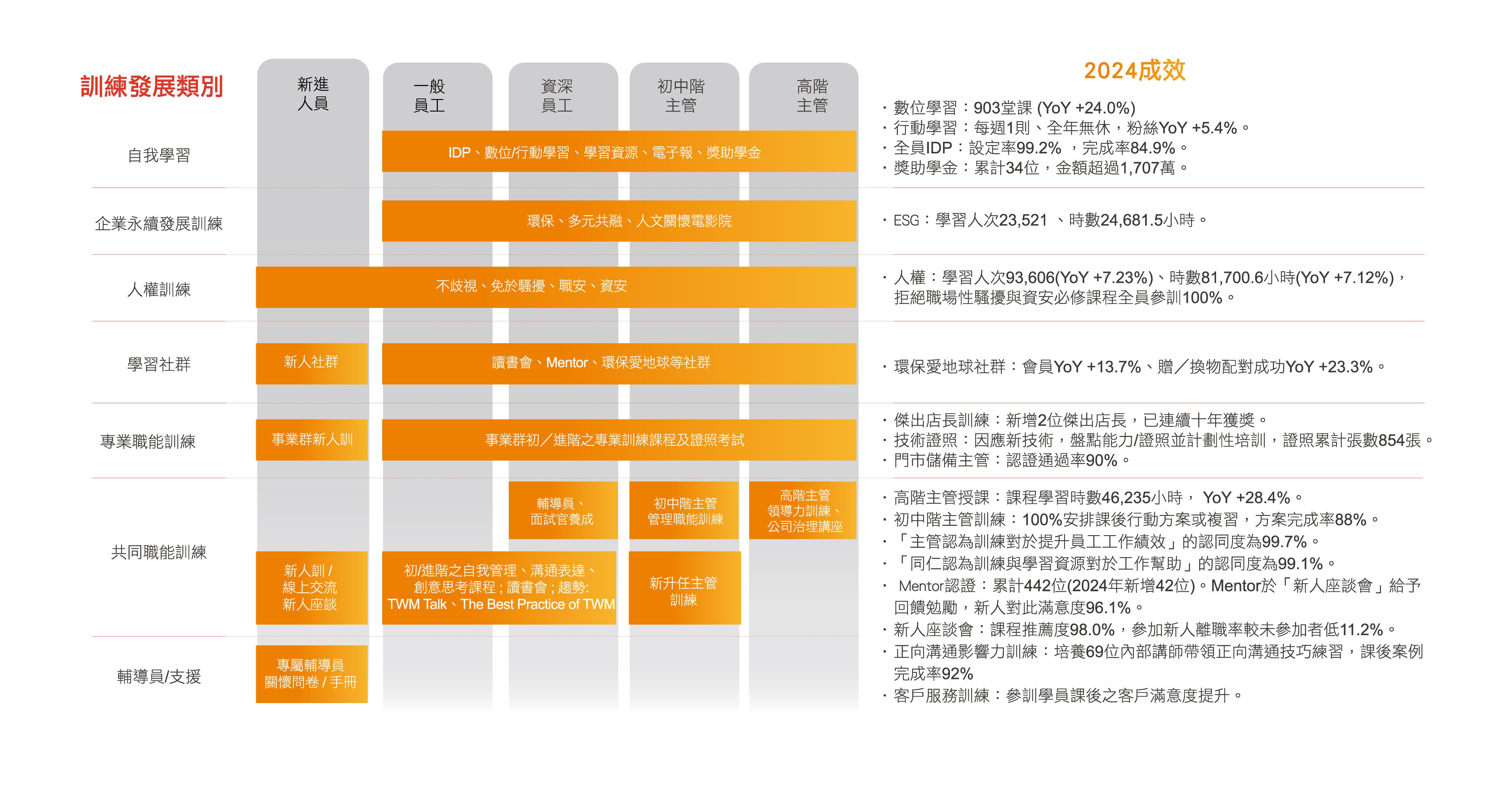 2024年藉由內部講師,推展全公司之「正向溝通影響力」,並持續藉由「The Best Practice of TWM講座」讓內部典範有更好之擴散,訓練發展類別與2024年具體成效如下圖。