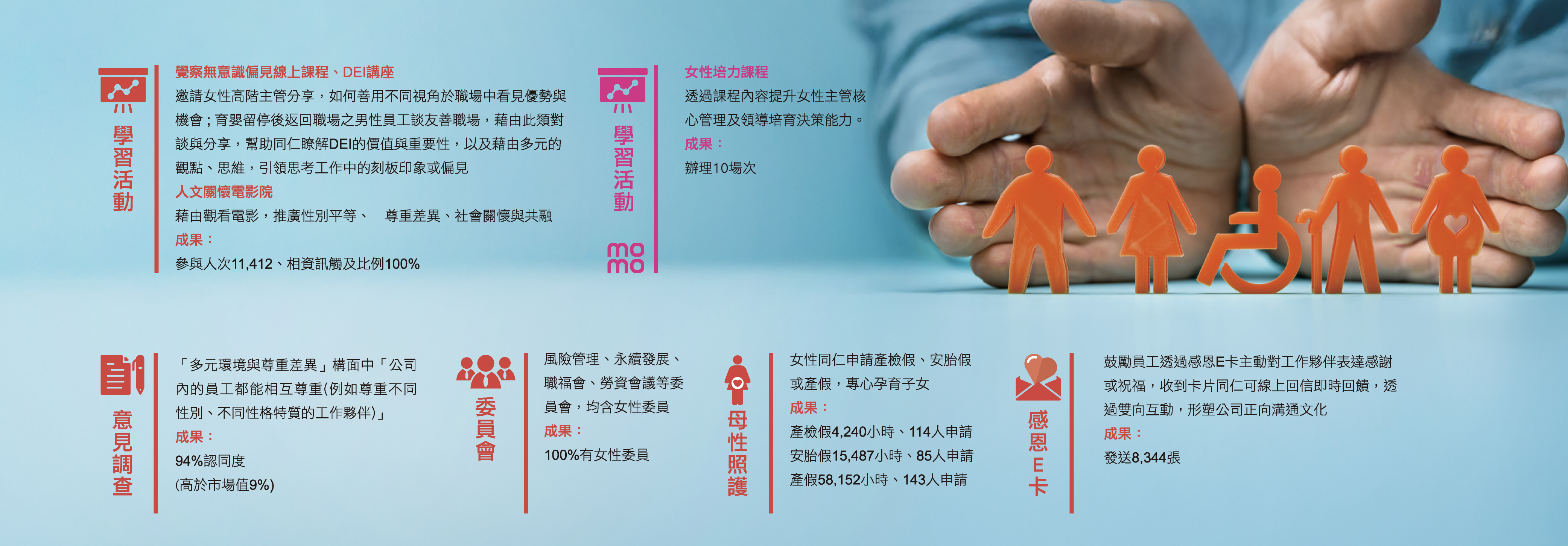 形塑多元共融文化,學習尊重差異與覺察無意識偏見,2024年成果如下表,打造多元友善職場。