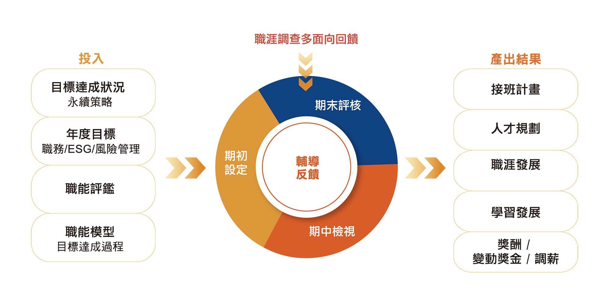 主管依據部門目標,綜合個人目標、職涯發展及多面向回饋,提供客製教導與培訓。