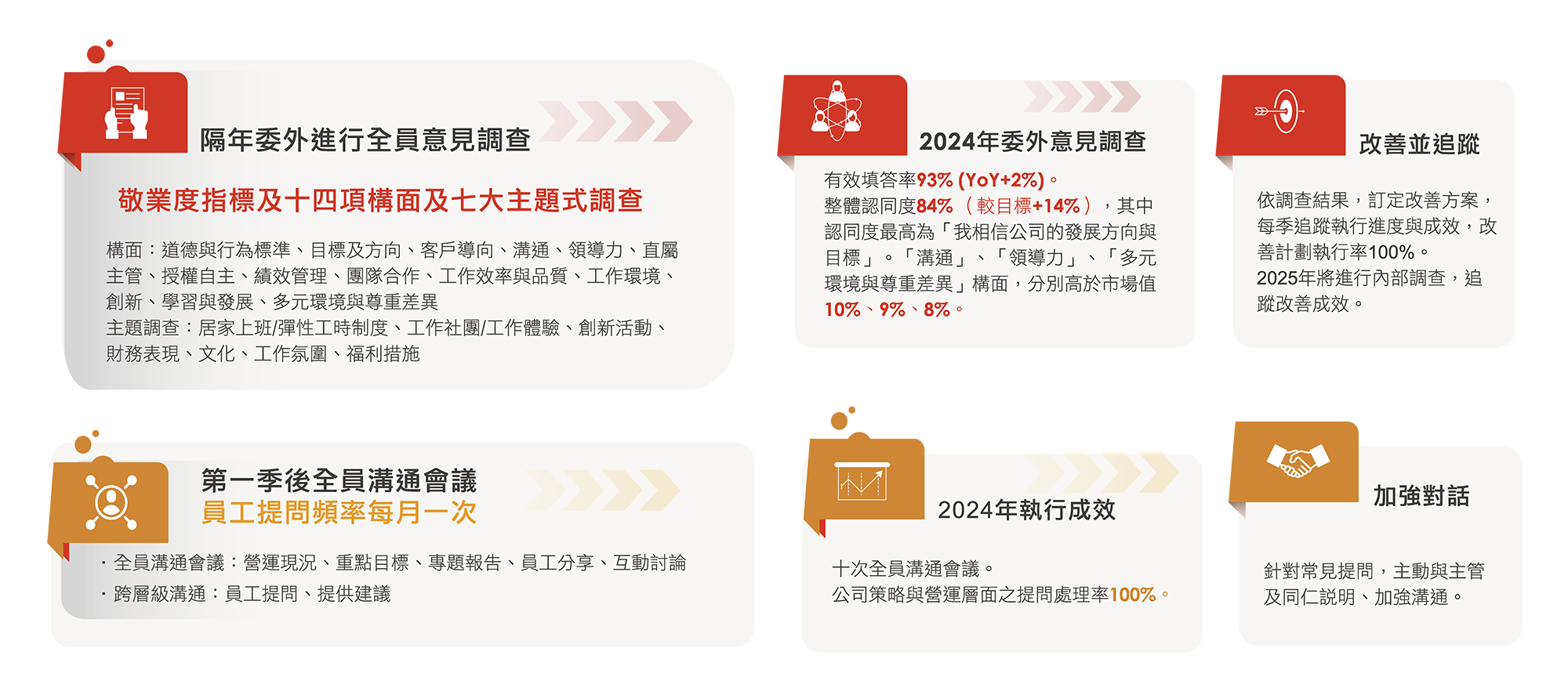 除定期透過員工意見調查,瞭解員工關切議題,也藉由定期每月全員溝通會議與員工提問,即時瞭解公司各層面狀況,並進行改善調整。與五年前相比之主題式調查中,員工最認同「公司的居家上班、彈性工時制度,能平衡工作與生活」。