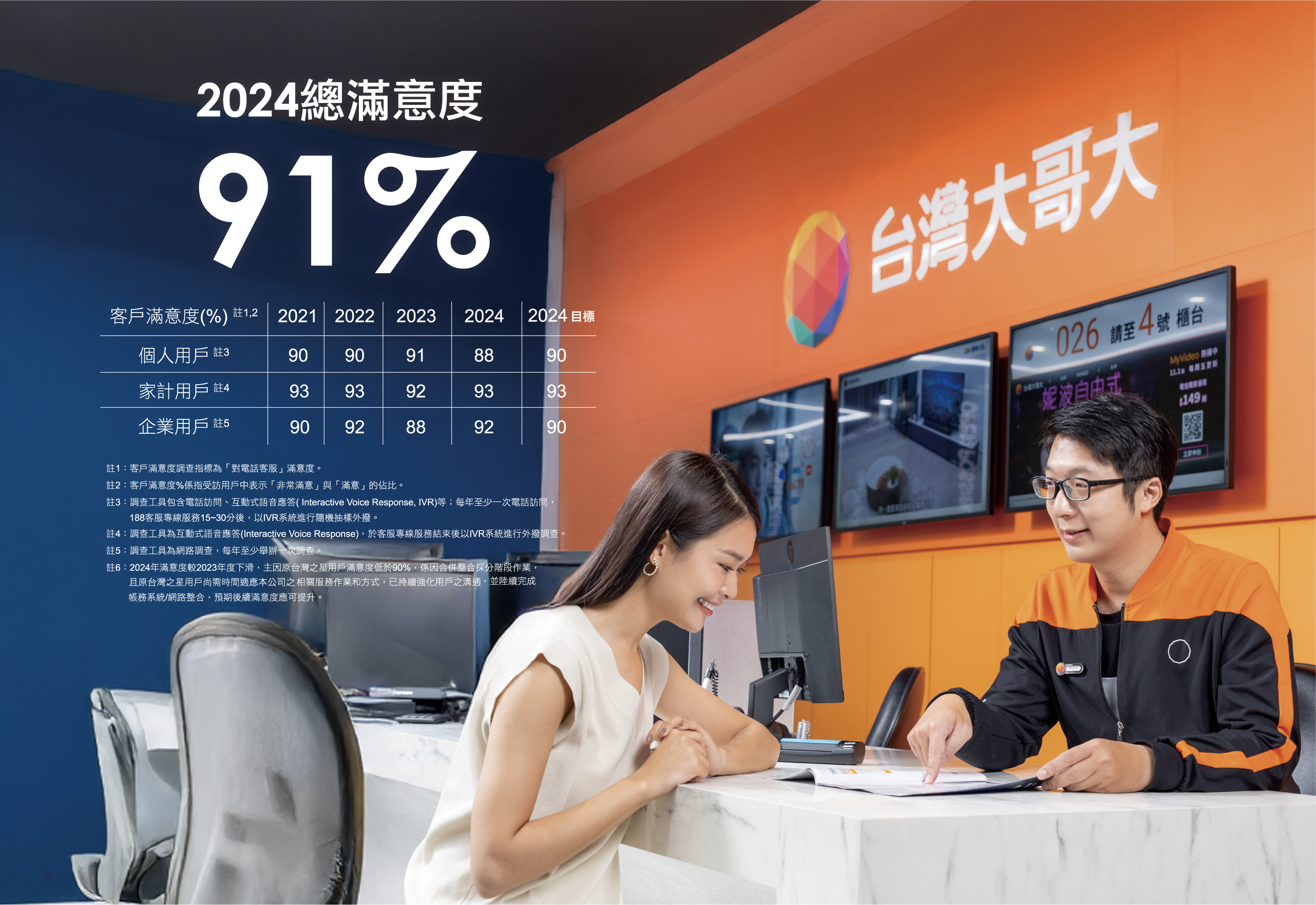 客戶滿意度%係指受訪用戶中表示「非常滿意」與「滿意」的占比。