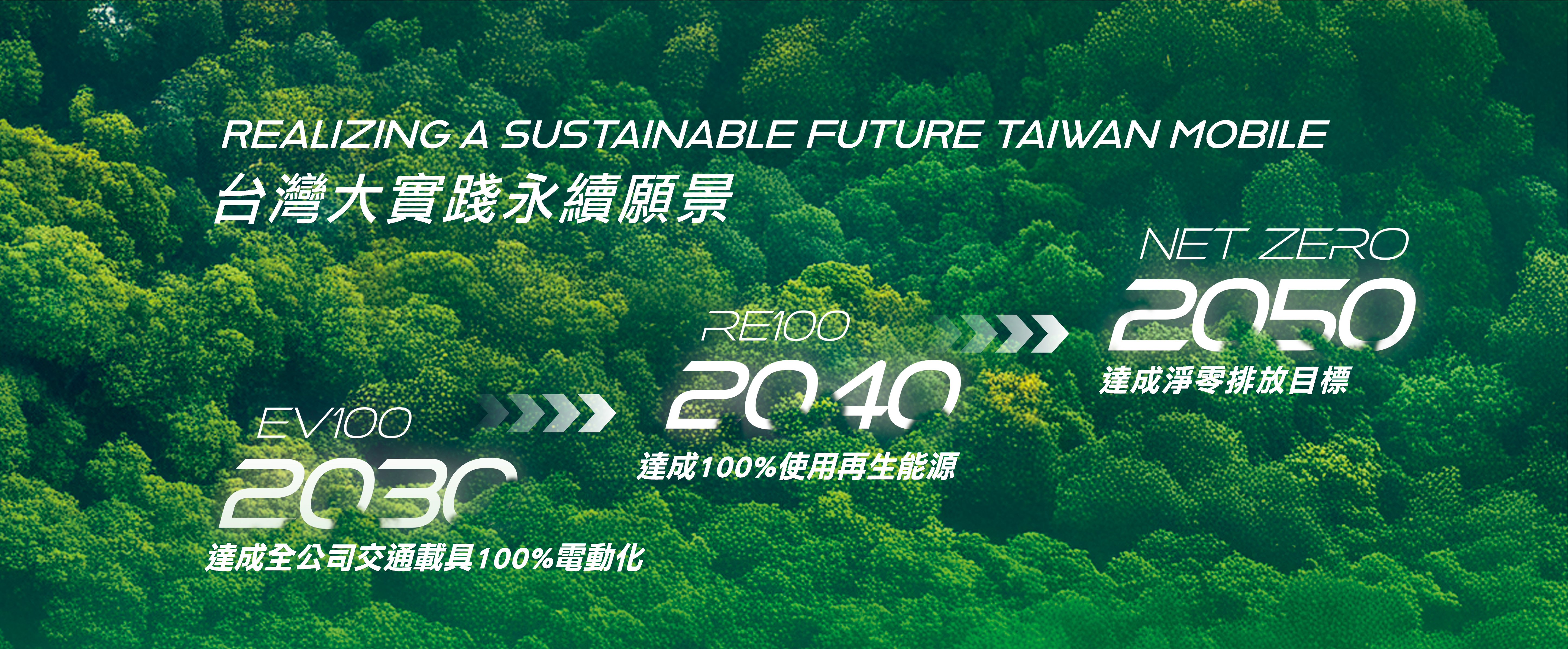 - 台灣大透過積極倡議環境永續價值,於2021年8月董事會承諾2030年IDC雲端機房100%使用綠能; 2040年全公司達到100%使用再生能源,並於2022年3月正式加入RE100,積極布局綠能使用,包含綠電採購、自建綠能電廠等,加速減碳腳步,目標實現淨零排放(Net Zero)承諾。