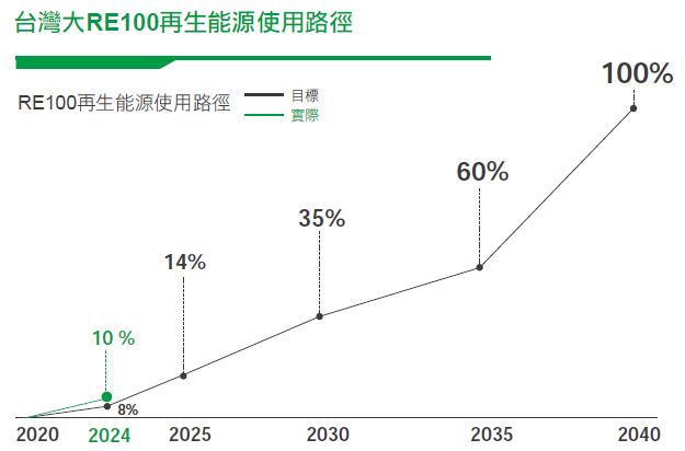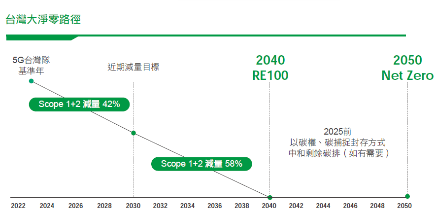 台灣大意識氣候變遷的重大性,於2015年推動綠能倡議,2016年定調「台灣大綠能 永續大未來」,內部持續推動全公司節能減碳、綠能採購;2018年率先 導入氣候相關財務揭露TCFD (Task Force on Climate-Related Financial Disclosures)並於2022年發行首本TCFD報告書、2024年發行首本自然相關財務揭露TNFD (The Taskforce on Nature-related Financial Disclosures)報告書;台灣大2019年起通過科學減量目標SBTi (Science-Based Targets initiative),隨著淨零轉型的重要性提升,2022年董事會宣布2050年達成淨零排放(Net Zero)並將2022年訂為淨零元年,隨後台灣大於2023年成為首家以控制升溫1.5°C情境通過SBTi審查2050淨零路徑之亞洲電信業;再生能源使用上,2021年董事會通過承諾2040年全公司達到100%使用再生能源,並於2022年正式加入RE100倡議,2024年台灣大雲端機房更提前目標年6年達成100%使用再生能源;2024年推動「台灣大藍碳 紅樹林復育計畫」全球首創紅樹林複合式養殖負碳技術,推動以自然為本的氣候變遷減緩解決方案;2024年同時為EV100元年,目標於2030年前實現全公司交通載具電動化。為與利害關係人共同實踐環境永續願景,我們提出以下目標與五大核心策略。