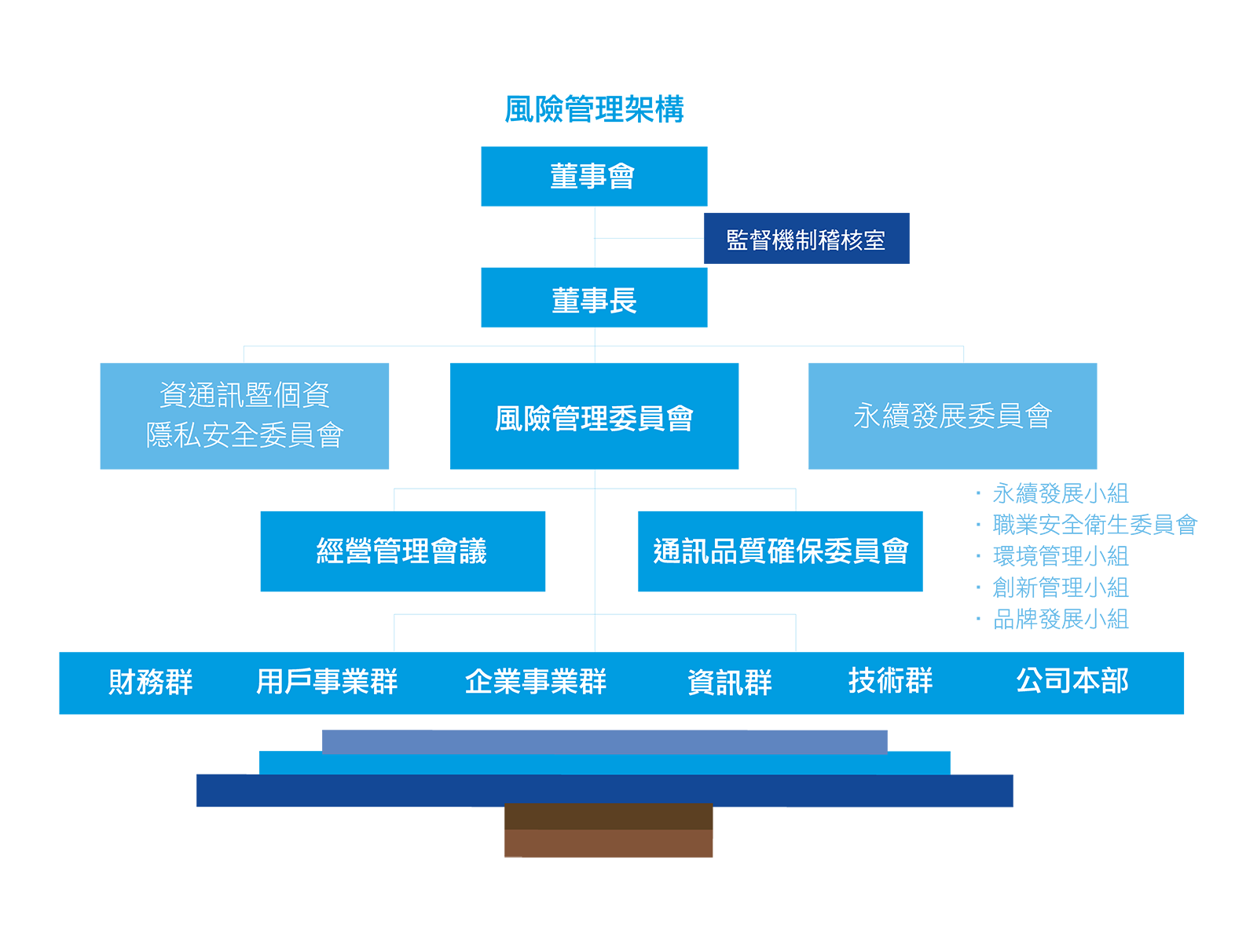 公司本部、資訊群、技術群、用戶事業群、財務群 | 為確保及時察覺及有效管理風險,各風險項目皆指定權責單位負責管理 各權責單位於日常維運時,即需將各風險項目控制於可接受水準之下,並於風險狀況異動時及時提報,以利公司採行因應措施 |