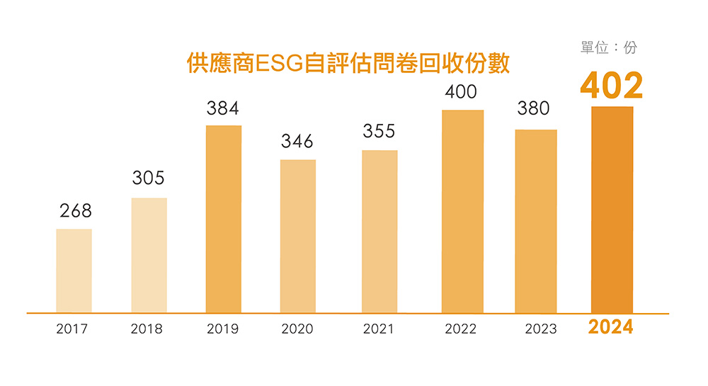 | 供應商審查家數 (包含書面、實地審查) | 402 | 重大供應商審查比例100% |