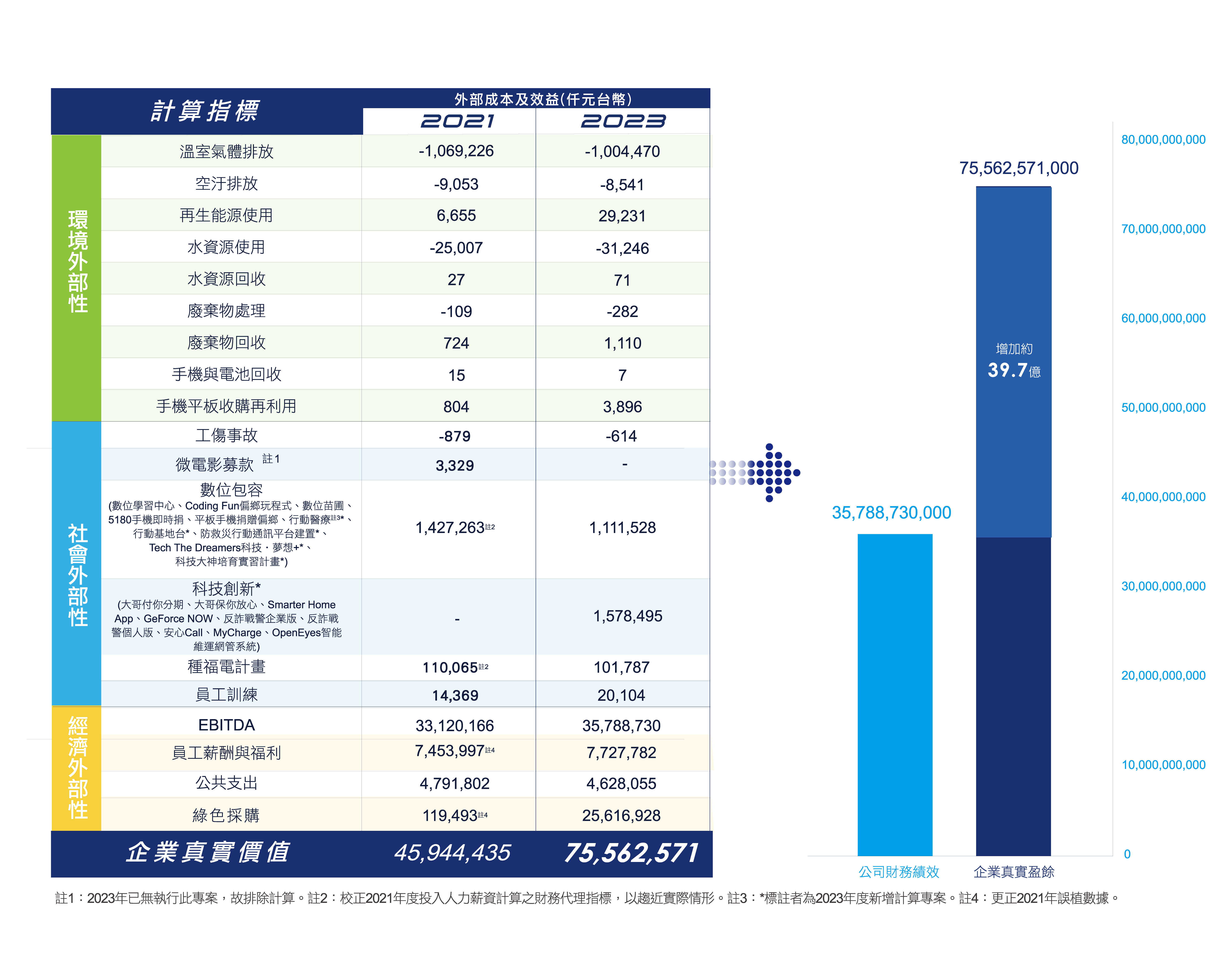 台灣大自2015年起每兩年評估自身營運在環境、社會與經濟各面向所產生的真實價值(True value),2024年已完成時間範疇為2023年的價值評估。2023年企業真實價值較公司財務績效提升約39.7億元。然,營運過程造成的環境外部性不容忽視,我們據此積極提高再生能源使用、導入智慧節能系統,及加強資源循環再利用等。擬持續將真實價值導入商業模式,強化TWM識別與因應風險的能力,並主動掌握潛在商機,提升整體營運韌性與競爭力。