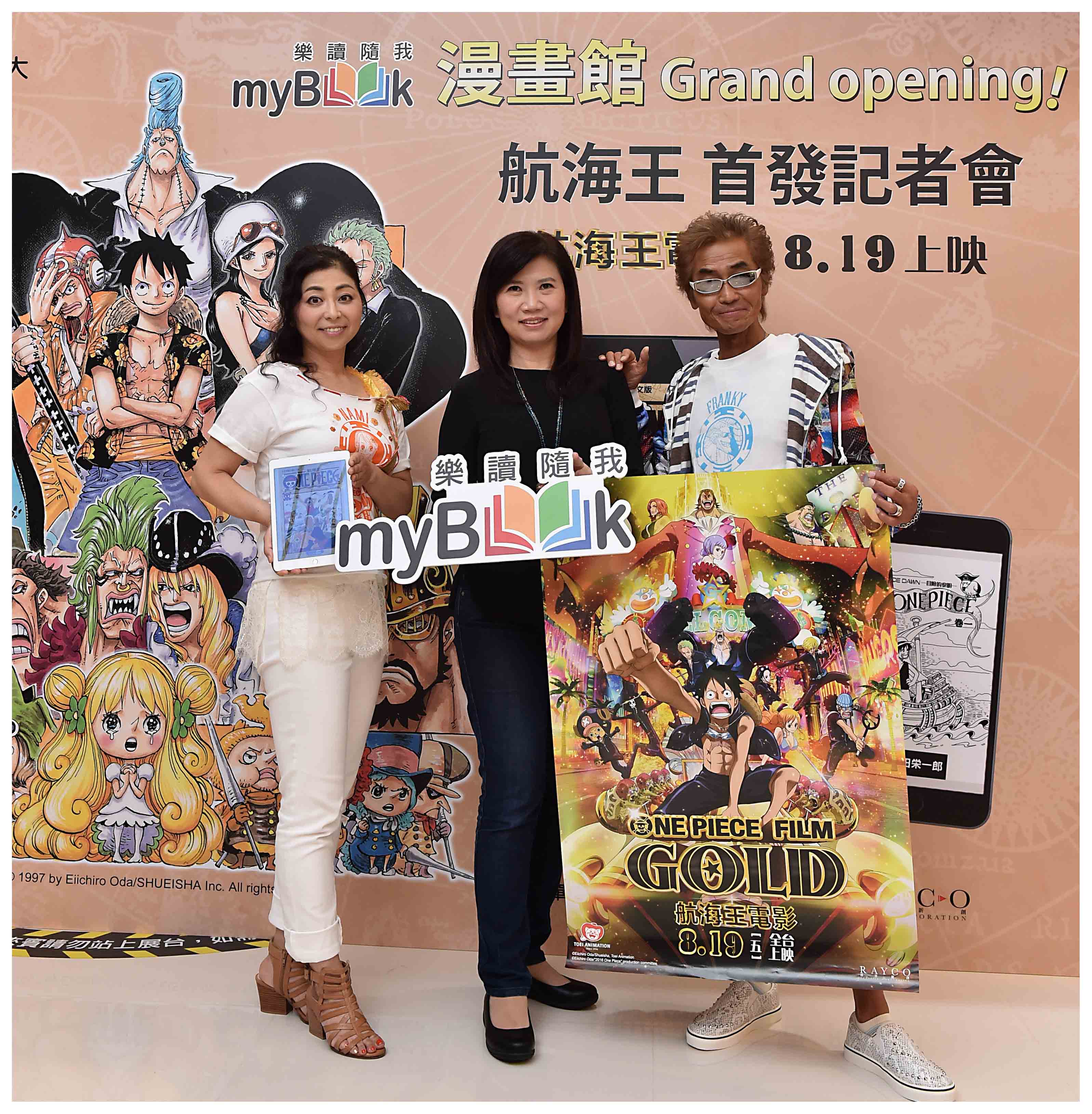 台灣大哥大今(12)日舉辦myBook漫畫館Grand Opening記者會,邀請到為《航海王》電影人物「佛朗基」與「娜美」配音的兩大日本知名聲優-矢尾一樹與岡村明美,蒞臨現場為myBook漫畫館開館活動站台,原音重現漫畫經典台詞,兩位聲優一開口,就讓現場粉絲「聲」歷其境,將大家帶回到航海王的故事場景中,真實感受到漫畫中的角色魅力。兩位聲優今天在現場也以「佛朗基」與「娜美」的聲音,同聲喊出「myBook讚!」,號召大家支持myBook漫畫館!同時也希望粉絲們在8月19日進戲院支持航海王今年最新作品《航海王電影:GOLD》,目前全台myfone直營門市,皆開放索取航海王電影限量優惠券,讓粉絲們好康收不完。