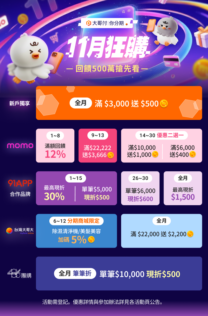 「大哥付你分期」於雙11期間,攜手91APP合作品牌,針對不同消費金額祭出優惠券現折回饋。自11月1日至15日,單筆滿1,111元即享333元現折、滿5,000元則折500元;整個11月單筆滿2,000元可享5%折扣,最高可折1,500元;11月26日至30日則加碼推出單筆滿6,000元現折600元。各優惠券限量使用,鼓勵用戶儘早下單把握優惠。多檔活動接力開跑,讓消費者於各品牌官方商城輕鬆分期、筆筆回饋。
