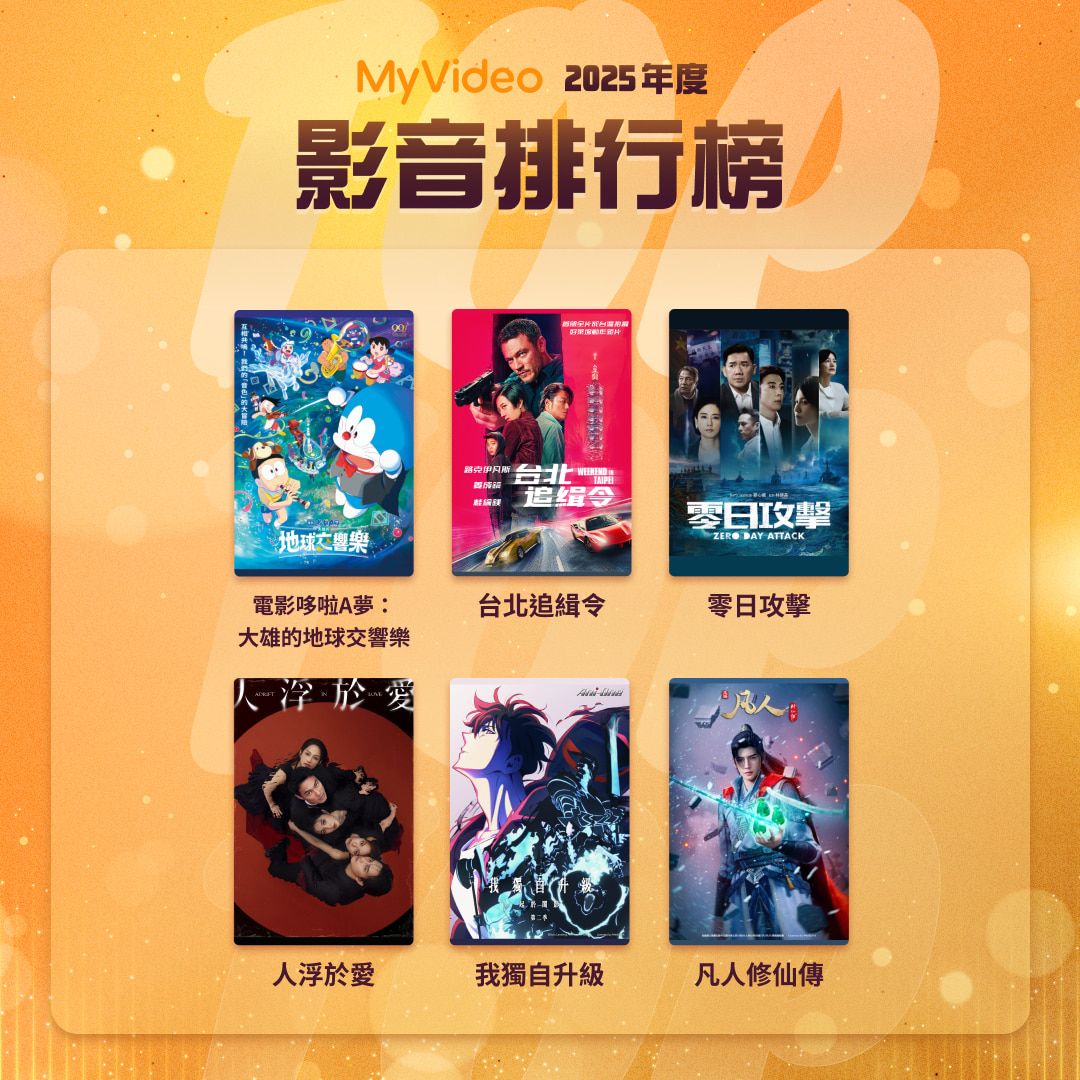 MyVideo年度電影榜呈現「動畫×動作片」雙特色。年度冠軍《電影哆啦A夢:大雄的地球交響樂》以延續經典IP魅力,適合闔家大小共賞奪冠;《台北追緝令》、《不可能的任務:最終清算》及《F1 電影版》等好萊塢動作片延續電影高票房及好口碑,展現院線電影在串流影音平台的長尾效應。推動電影館總觀看小時數較去年提升超過41%。