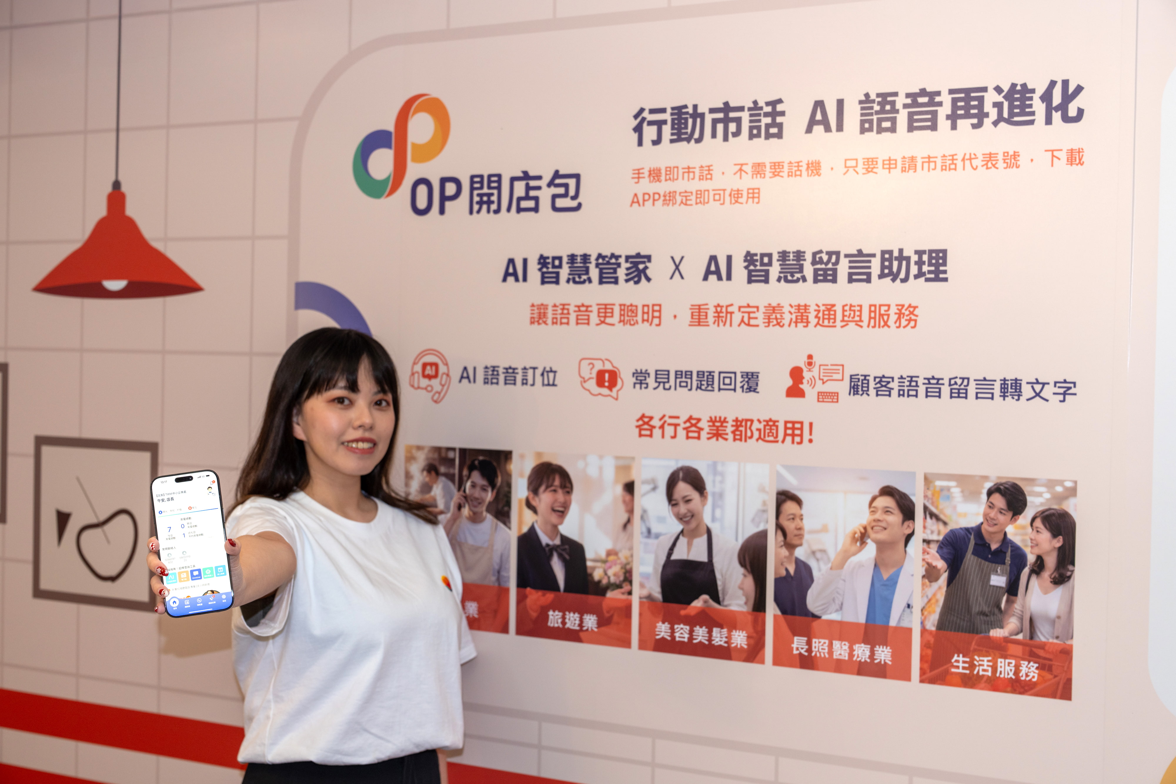 台灣大哥大現場亦展出自研「OP 開店包 APP」,整合「行動市話」服務,全方位掌握店務管理。同步展出整合「點點全球」的智慧餐飲平台與「智慧餐飲機器人」,透過線上點餐、自動送餐的軟硬體協作,大幅降低外場人力需求。在獲客方面,串聯「MENU 店+」Google 地圖預訂與預收訂金機制,將搜尋流量轉為實質訂單並減少 No-Show 損失;以及「Jamstation」專為店家打造的智慧聲音行銷平台,結合店內合法音樂及AI語音廣告,帶動業績顯著成長15%。