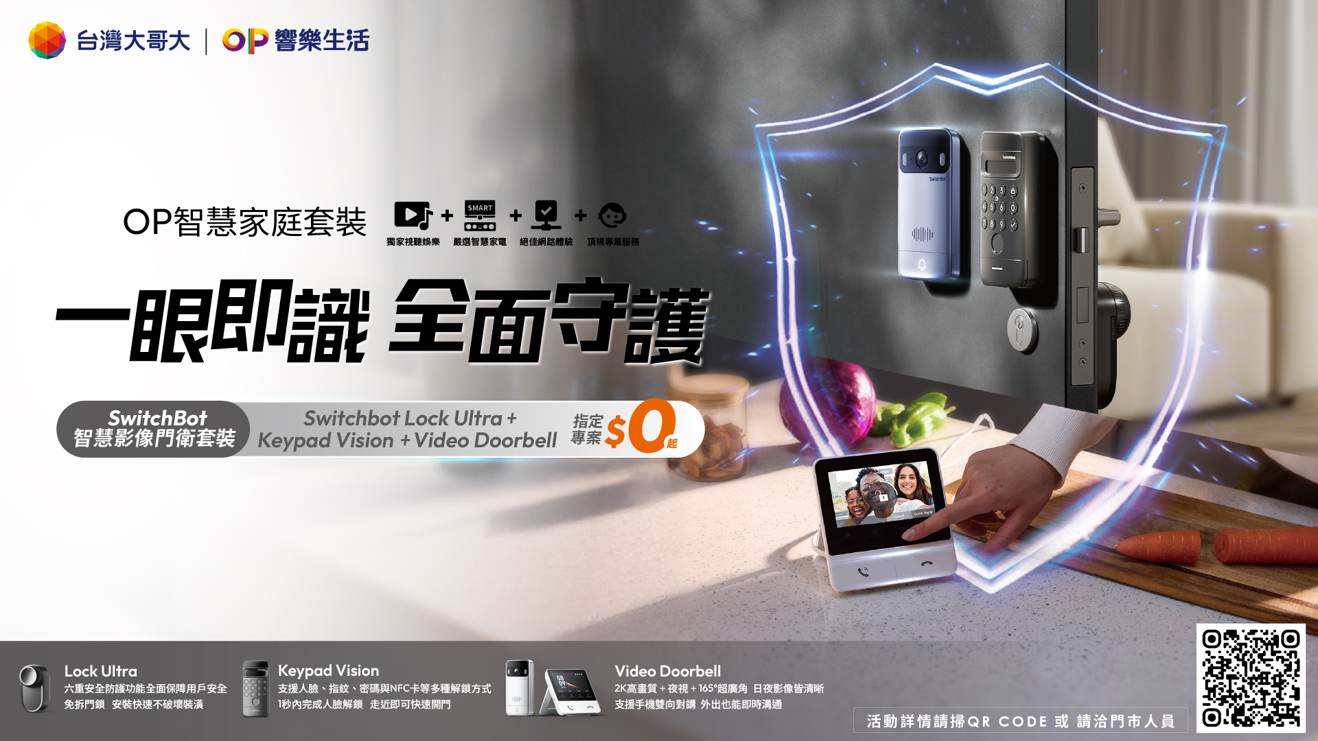 台灣大哥大今(2)日宣布擴大「OP響樂生活」旗下「OP智慧家庭」套裝,推出全新「SwitchBot智慧影像門衛套裝」,整合免拆鎖安裝的SwitchBot Lock Ultra門鎖旋鈕機器人、搭載3D人臉辨識技術的Keypad Vision智慧可視鍵盤,以及具備2K高畫質與165°超廣角視野的Video Doorbell智慧視訊門鈴,從開門方式、訪客辨識到門口即時監控一次升級。用戶走近即可啟用人臉辨識解鎖,手機遠端對講與開門同步完成;且門口影像清晰可回放,打造更安全便利的居家入口管理。亦可串聯Apple Home與Google Home平台,整合語音助理與智慧場景設定,讓家門成為智慧家庭的第一道安全防線,搭配5G月租999元、綁約36個月,即可0元帶走全新「智慧影像門衛套裝」。同時,為讓消費者親身感受智慧門鎖的便利性,即日起在全台100間myfone直營門市開放展示體驗。