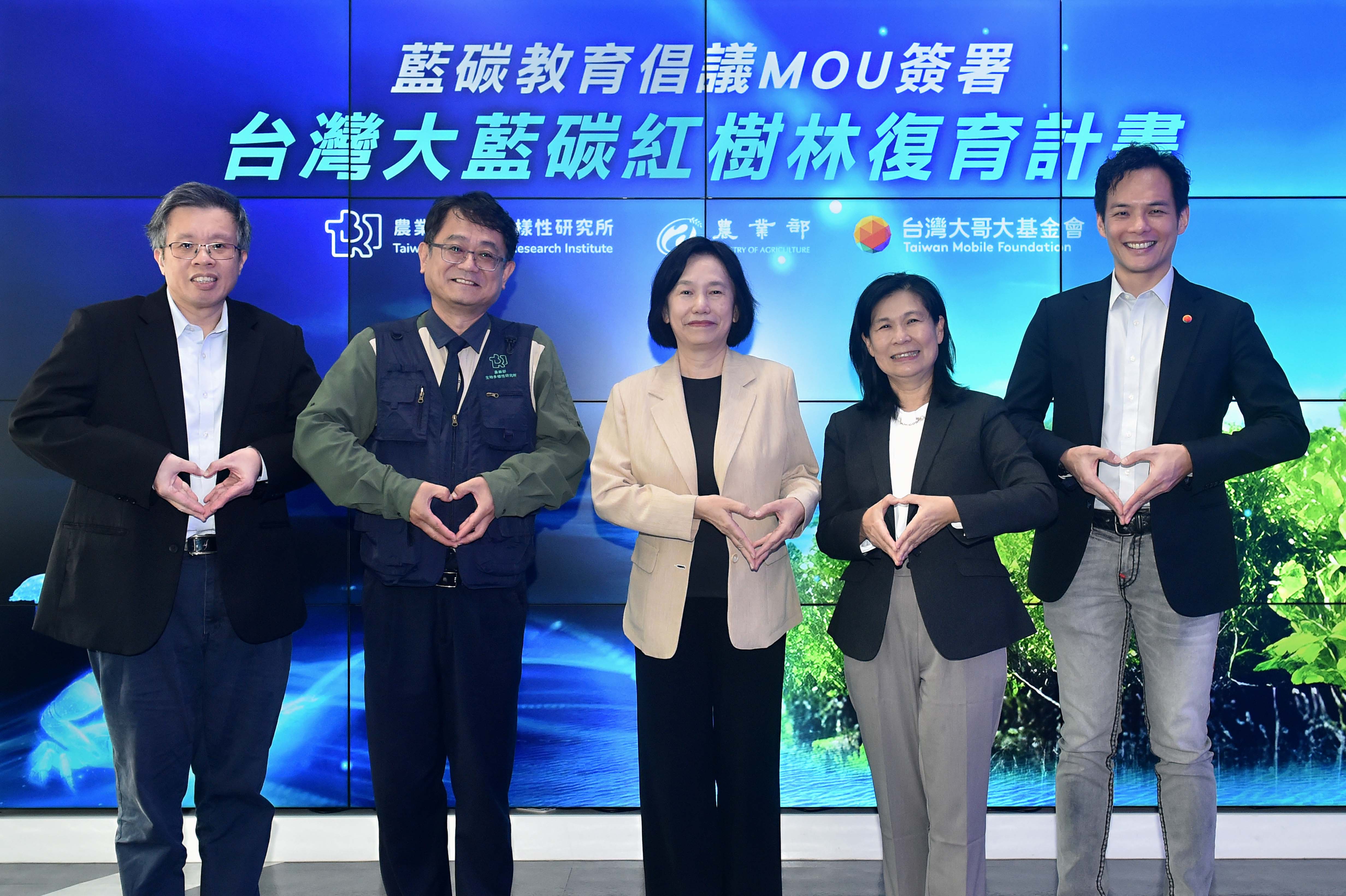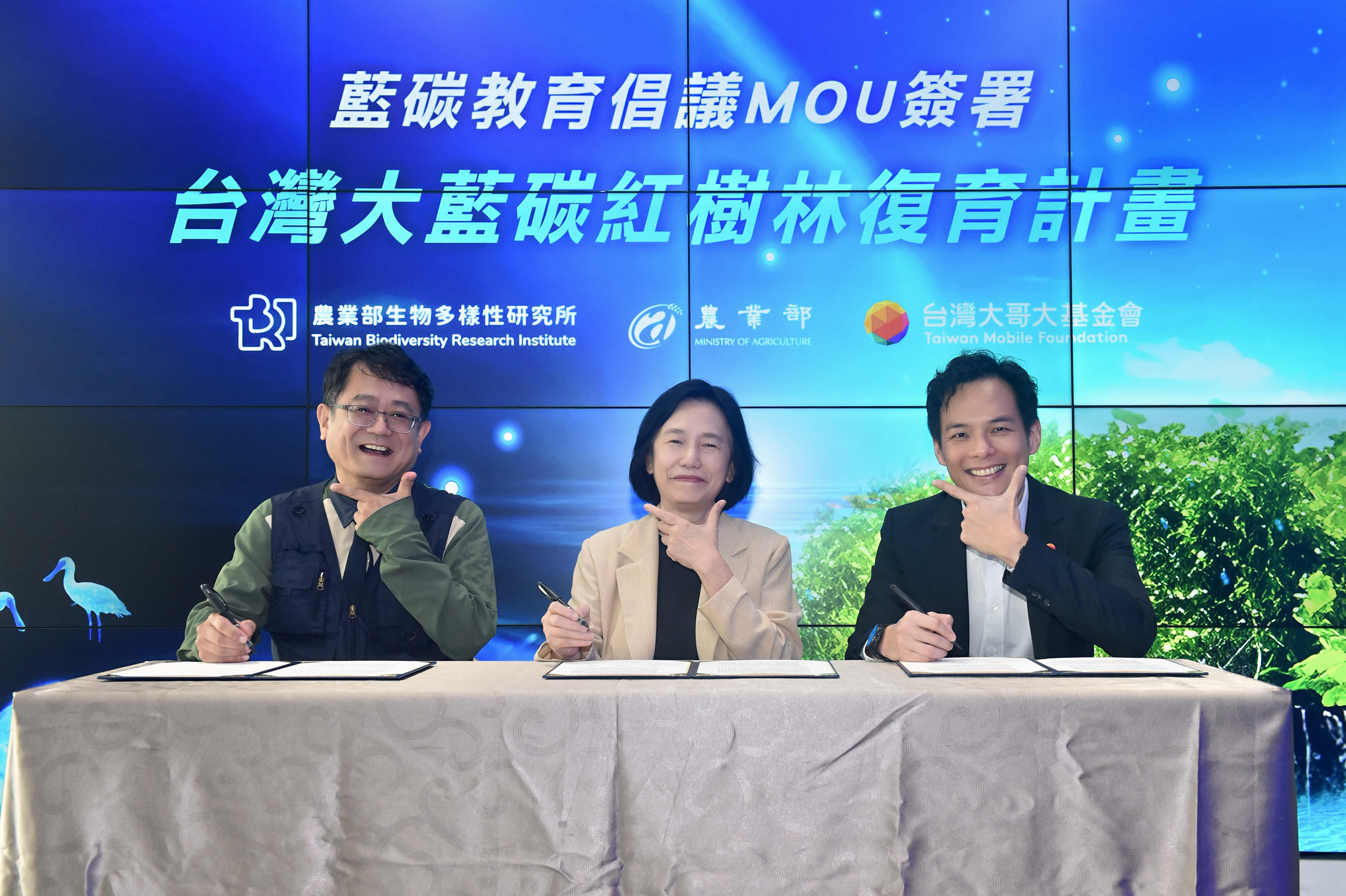 台灣大哥大基金會今(17)日與農業部生物多樣性研究所(以下簡稱生多所)簽署「藍碳教育倡議」合作意向書(MOU),攜手將全球首創的「台灣大藍碳 紅樹林復育計畫」研究成果轉譯為易懂的科普教材,並規劃在地種子教師培訓、校園課程及社區公民科普推廣等行動,帶領大眾認識藍碳如何守護生態、助力減碳。MOU由台灣大哥大總經理兼基金會執行長林之晨與生多所所長楊嘉棟代表簽署,農業部常務次長杜文珍見證,盼串聯全民與價值鏈夥伴擴大逆轉氣候變遷的行動力。